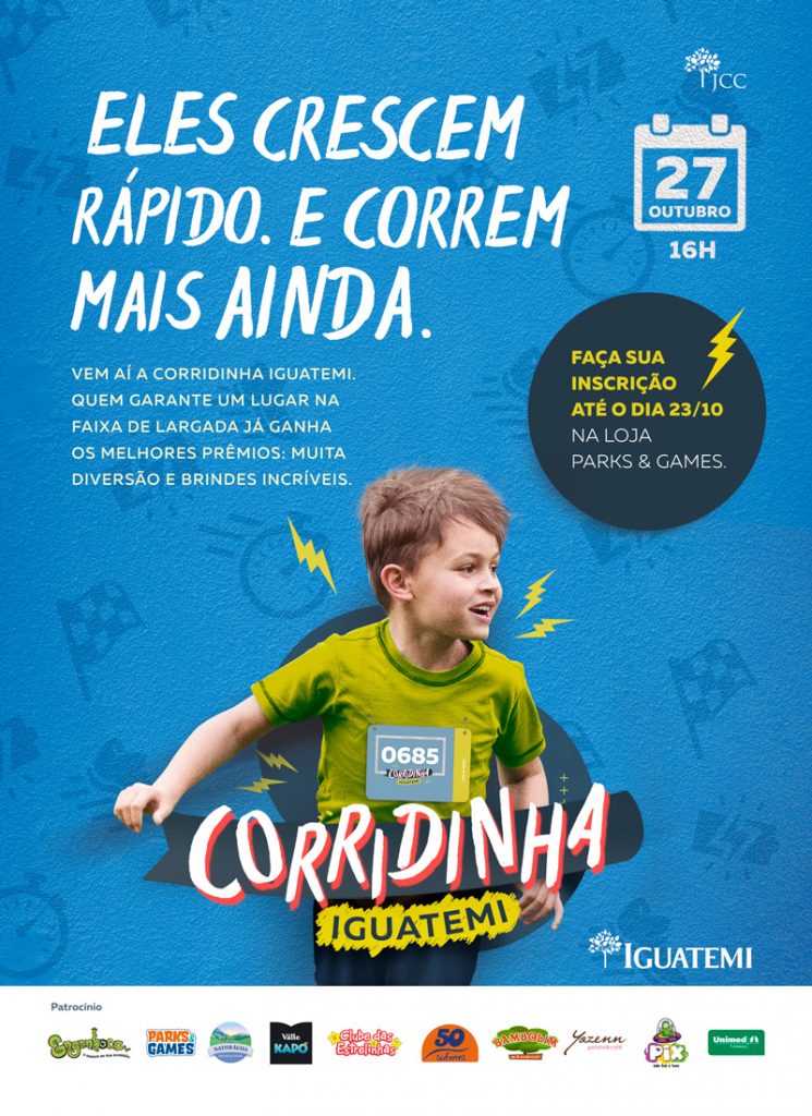 Com percursos variando de 50 a 150 metros, a 10ª edição da Corridinha Iguatemi já tem data para acontecer: 27 de outubro, às 16 horas. As inscrições com vagas limitadas começam hoje, 21 de setembro, e custam R$ 60,00 + 1kg de alimento não perecível, que será doado para a Casa do Filho Pródigo. O evento é voltado para crianças com idade entre 4 e 10 anos, mas é bastante esperado também pelos pais, que vibram com o esforço dos filhos e se divertem ao verem seus pequenos cruzando a linha de chegada. As inscrições para a Corridinha Iguatemi podem ser feitas até o dia 23 de outubro, no, localizado na praça de alimentação do térreo. Todos os participantes receberão medalhas ao final do percurso.