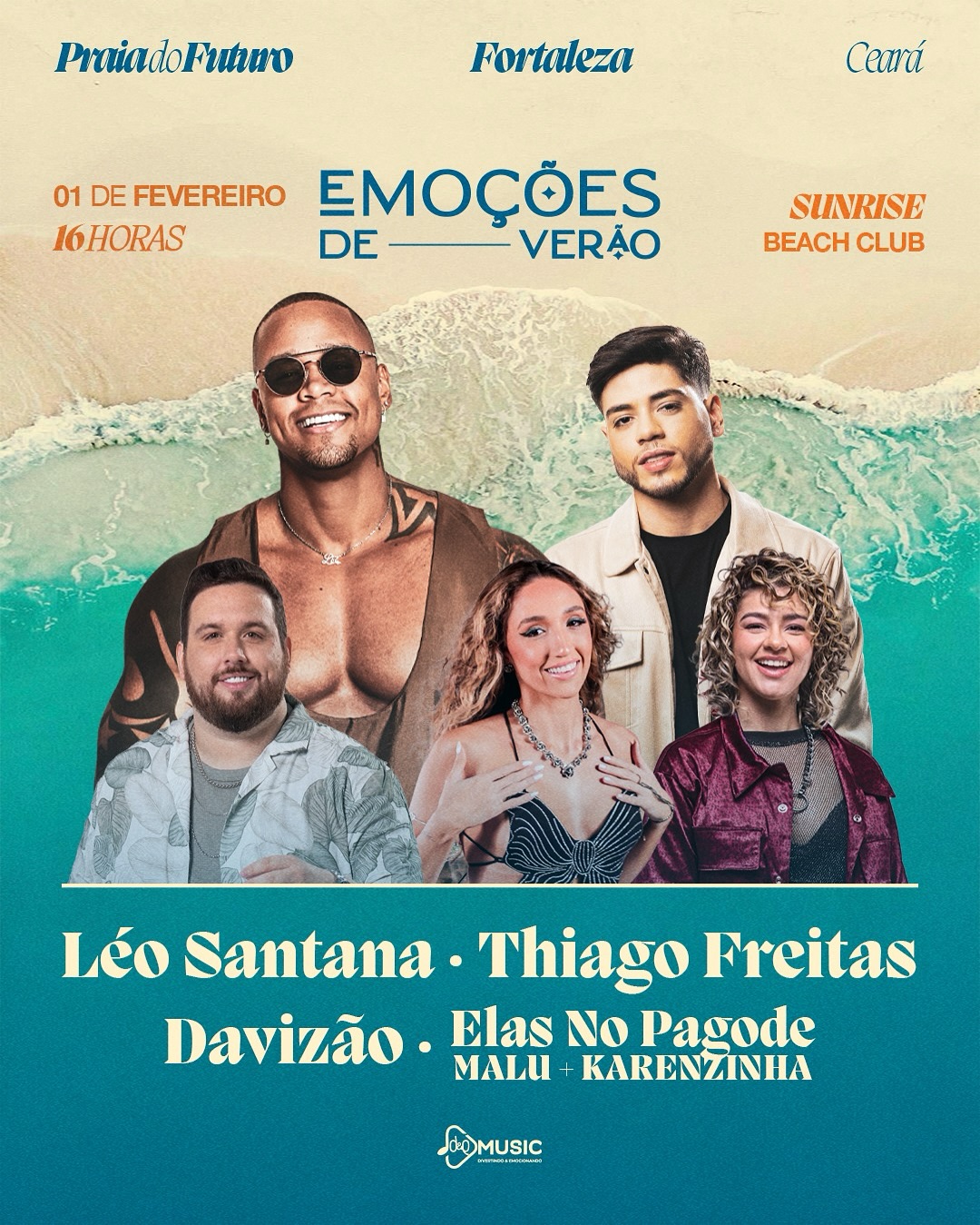 Com uma estrutura completa à beira-mar, o Emoções de Verão une música, gastronomia e lazer em um ambiente perfeito para celebrar a temporada mais animada do ano. A proposta do evento é reunir diferentes gêneros musicais em uma experiência única, atraindo públicos de todas as idades para curtir noites inesquecíveis. A produção é da cearense D&E Music, com 27 anos de experiência na área.
