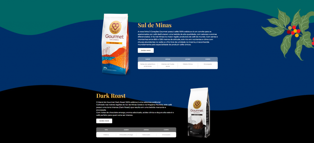 A linha de café gourmet 3Corações oferece a você as melhores inspirações do Brasil, contadas em experiências distintas na produção do café moído e torrado. Uma linha de cafés 100% Arábica de diversas regiões unindo a arte de fazer café com o memorável legado humanista. Além disso, em cada embalagem você encontrará notas com experiências sensoriais únicas e grãos de altíssima qualidade.
