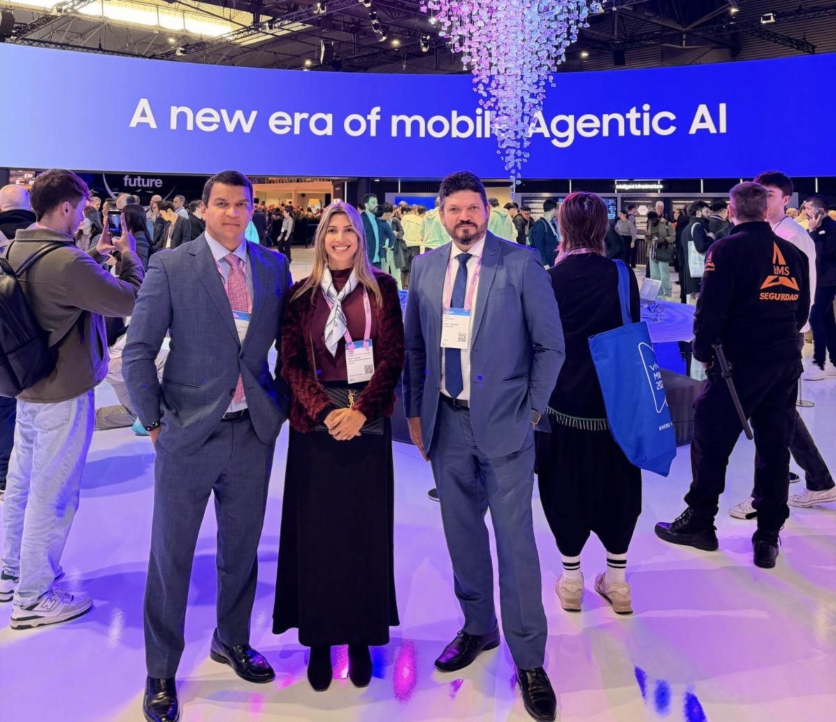 Flávio Santos, diretor-geral da Entidade Administradora da Conectividade de Escolas (EACE) junto de Jhon Ribeiro, diretor de Comunicação e Relações Institucionais; e Rafaela Calado, assessora de Relações Institucionais, e estão entre os integrantes da delegação brasileira que participam do Mobile World Congress (MWC), que acontece até quinta-feira, dia 5 de março, em Barcelona, na Espanha. Considerado o maior evento global de tecnologia e conectividade móvel, o congresso é organizado pela GSMA e reúne lideranças empresariais, governos, reguladores e especialistas de todo o mundo para debater os rumos da transformação digital.
