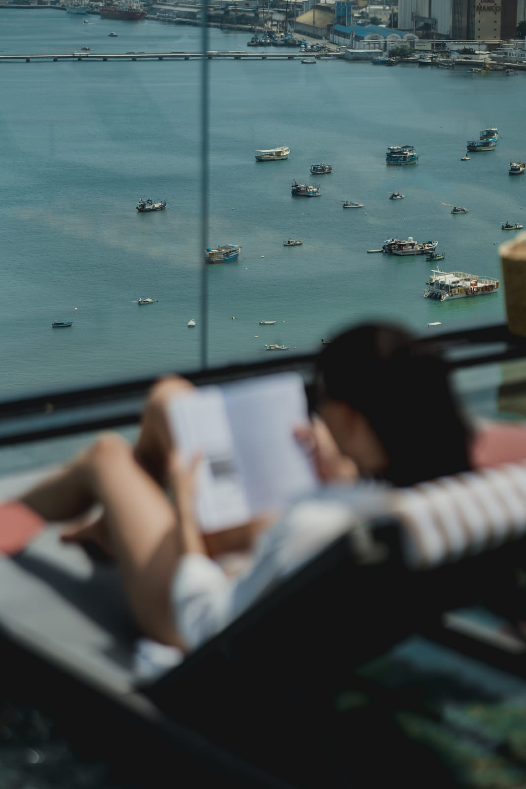 Responsável pelo retrofit de todo o Hotel, Racine detalha sua inspiração para o projeto do espaço. “A primeira intenção é gerar conforto para que se desfrute a vista 180 graus da orla com o máximo de comodidade. Nós redesenhamos a piscina e criamos uma espécie de “prainha”, que dialoga com o visual de maneira confortável e elegante. O lounge e o bar também foram redesenhados numa perspectiva sofisticada. Fizemos bom uso de madeira, que acolhe e traz mais aconchego. Por fim, destacamos o uso da coloração terracota, em sinergia do espetáculo do pôr do sol observado com perfeição na cobertura do Gran Marquise“