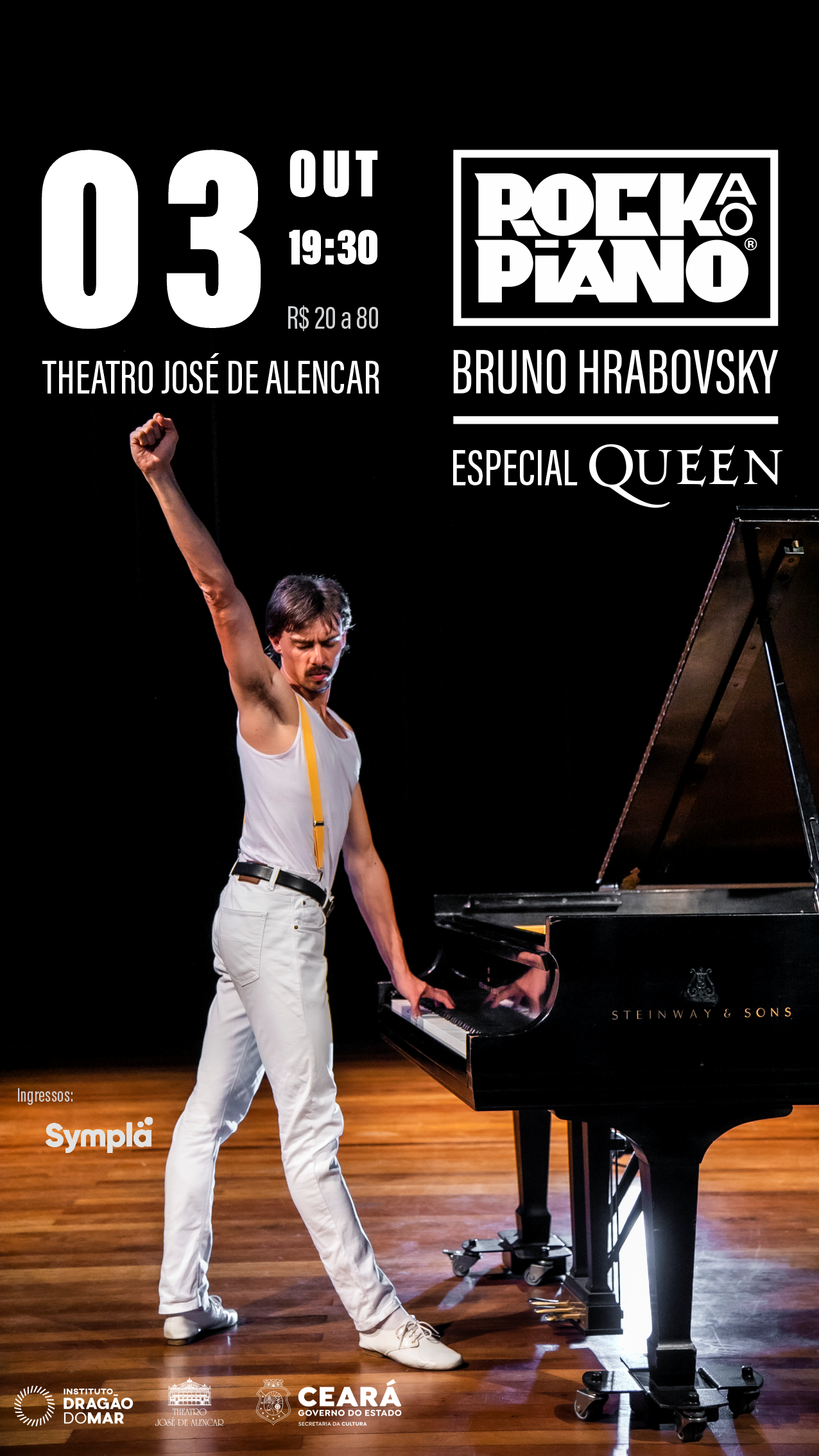 Queen ao Piano, com Bruno Hrabovsky. Quarta-Feira, 3 de Outubro, 19h30, no Theatro José de Alencar (R. Liberato Barroso, 525 – Centro, Fortaleza – CE). Ingressos: de R$ 35 a R$ 80 pelo site Sympla (https://bileto.sympla.com.br/