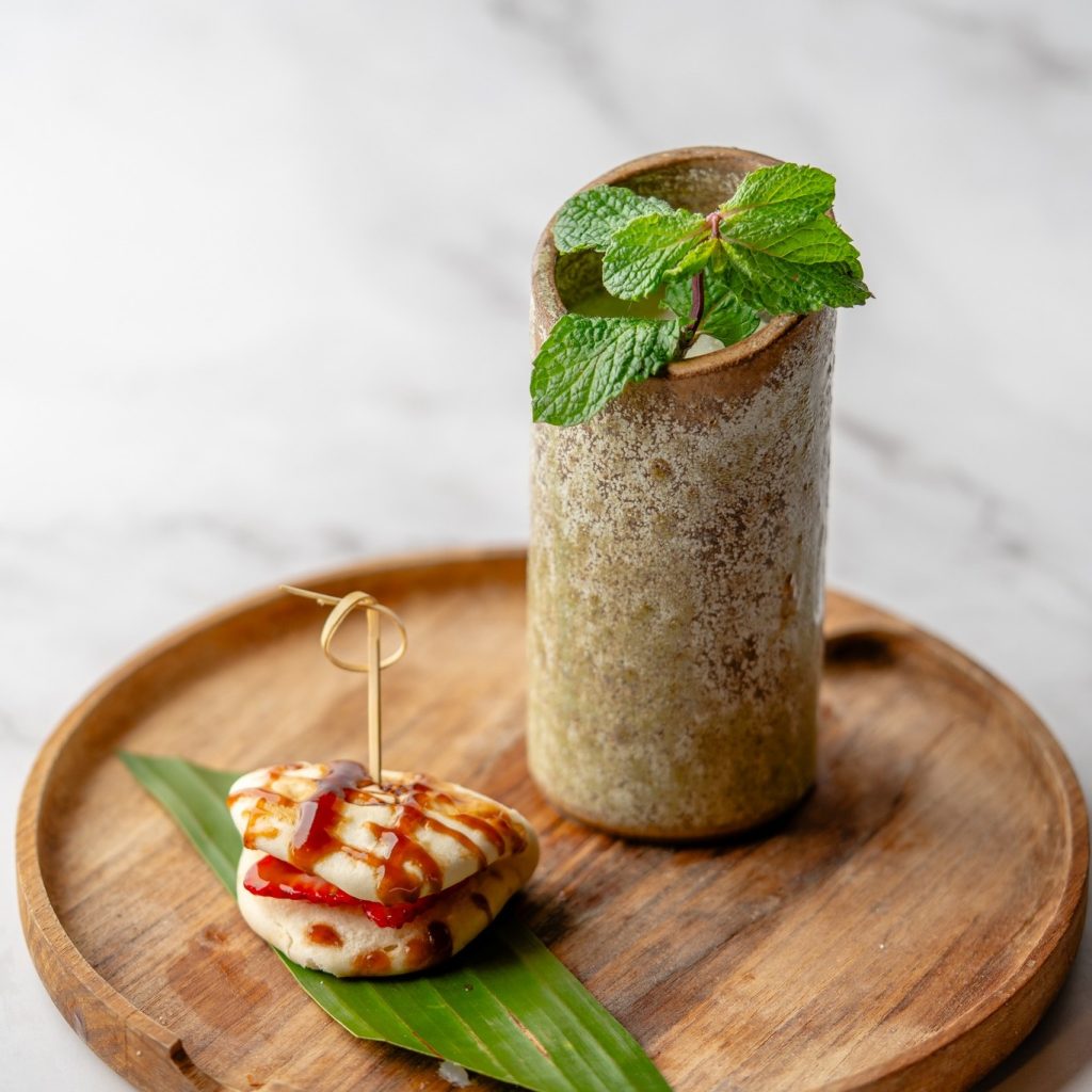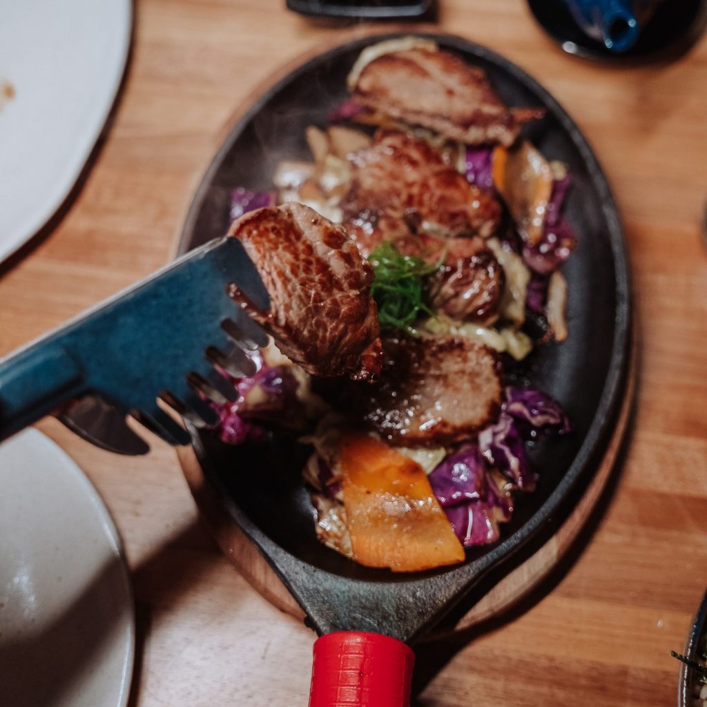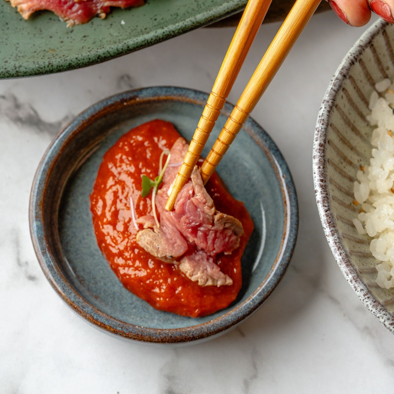 Filé mignon no estilo Coreano com folhas frescas e gohan.