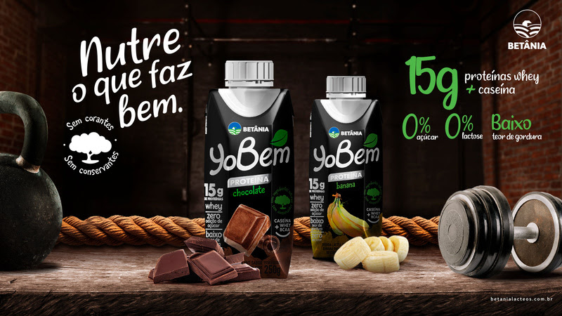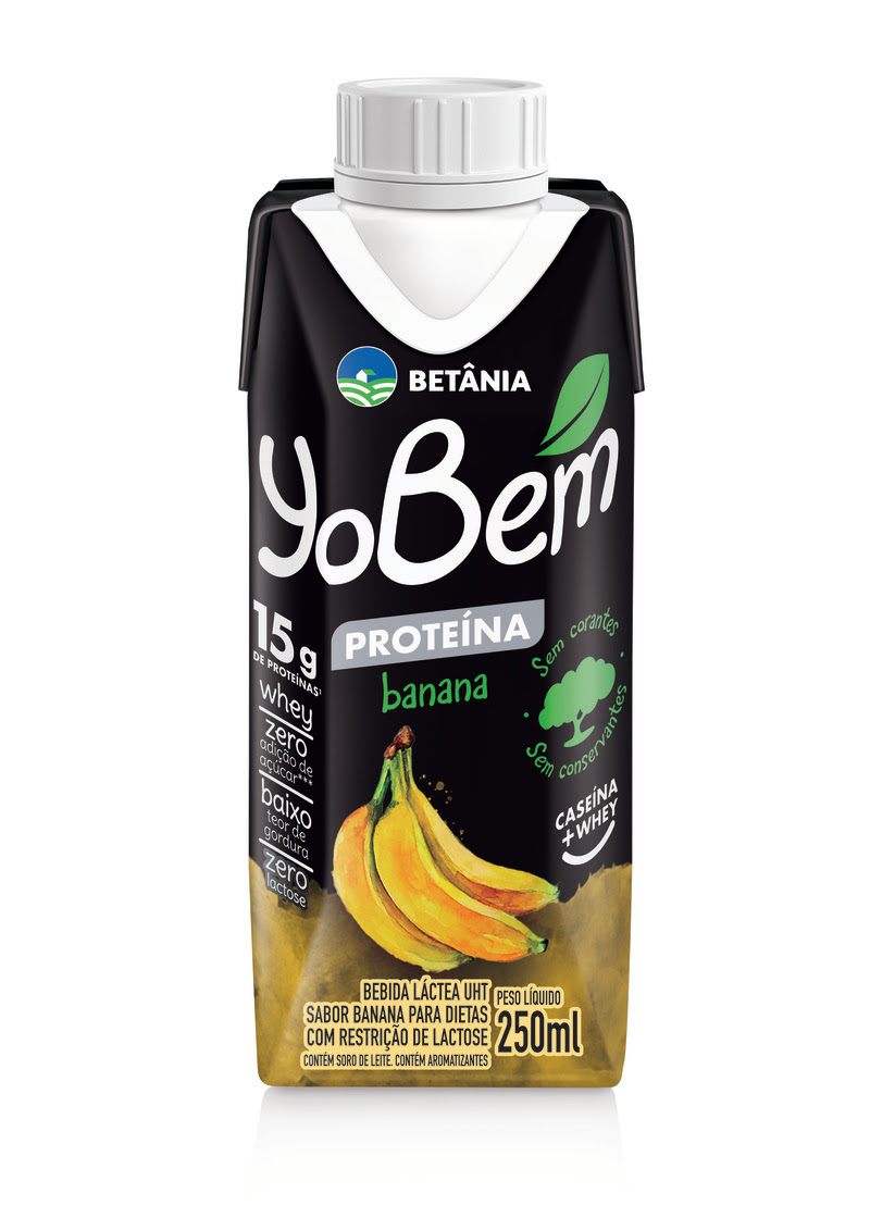 A Betânia, marca líder em leite UHT e iogurtes no Nordeste, amplia o portfólio de YoBem, sua plataforma de saudabilidade, com o lançamento de YoBem Proteína, bebida láctea enriquecida com 15g de proteínas whey + caseína, zero adição de açúcar, zero lactose, baixo teor de gordura, sem corantes e sem conservantes. YoBem Proteína chega ao mercado nos sabores banana e chocolate, em embalagem de 250ml.