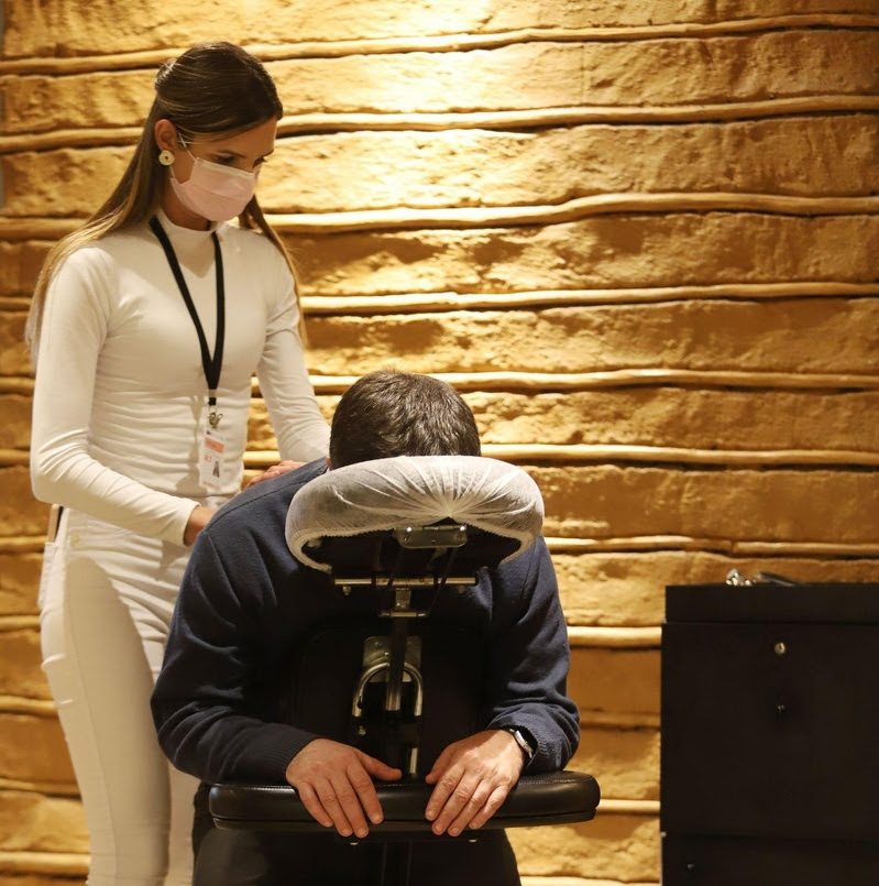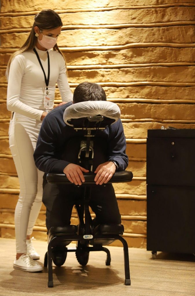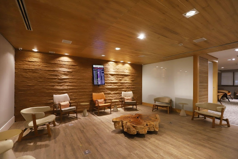 O ambiente é composto por salas de banho e de massagem, balcão gourmet e bar, diferentes tipos de sofás e poltronas e áreas dedicadas ao trabalho, que, juntos, criam uma atmosfera aconchegante e moderna para aguardar os voos.