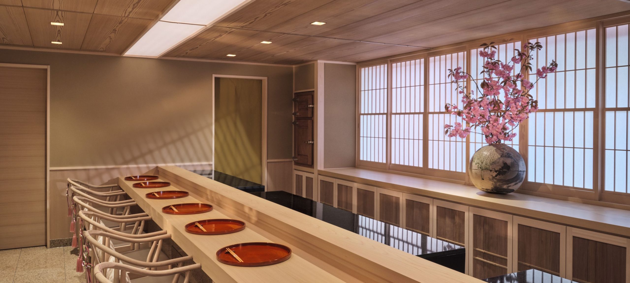 Todos os elementos do interior e da experiência foram cuidadosamente selecionados para incorporar o espírito dos restaurantes tradicionais de sushi de Tóquio. Os interiores que evocam um sentimento de harmonia e tranquilidade foram projetados por Itai-San, um mestre em restaurantes japoneses. Os vasos foram feitos exclusivamente para o Sushi Kanesaka pelo renomado artista de cerâmica Shiro Tsujimura. De acordo com a tradição, o restaurante mostra seus baús de gelo hinoki, usados pela primeira vez por chefs de sushi no período Edo – que permitem que a temperatura do peixe seja perfeitamente mantida.