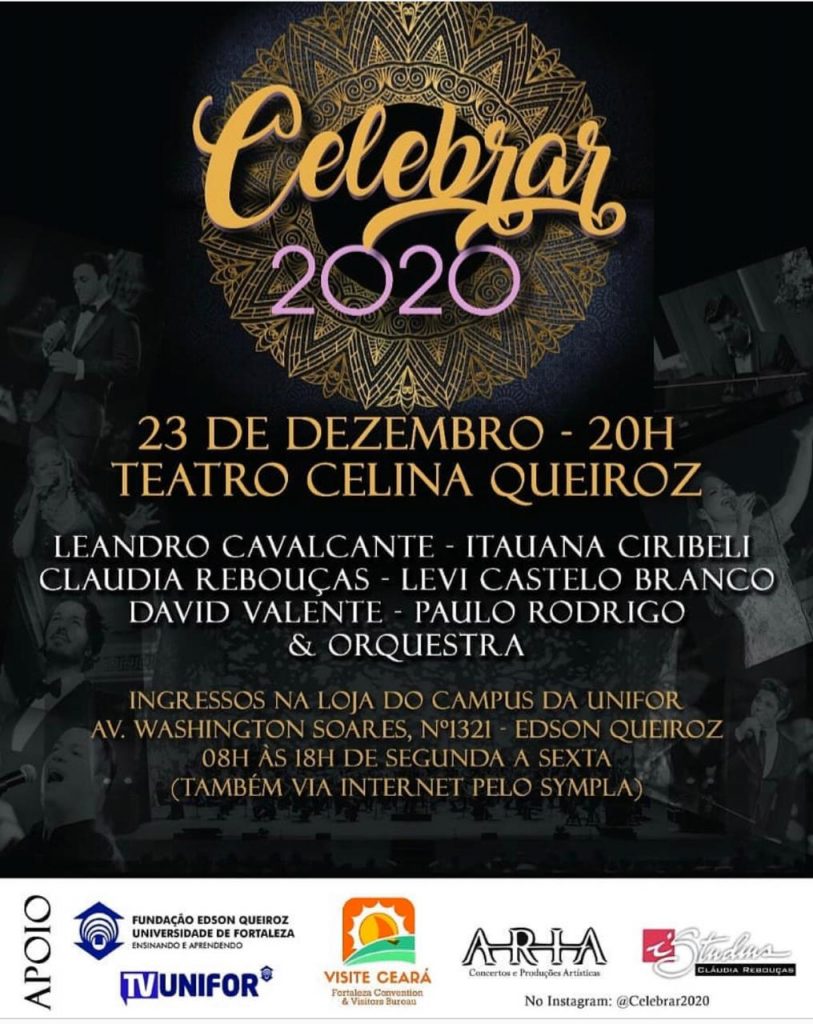 O Teatro Celina Queiroz, da Universidade de Fortaleza, sedia, próximo dia 23 de dezembro (segunda-feira), o evento Celebrar 2020, concerto festivo que acontece continuamente no Ceará e apresenta personalidades do cenário musical.