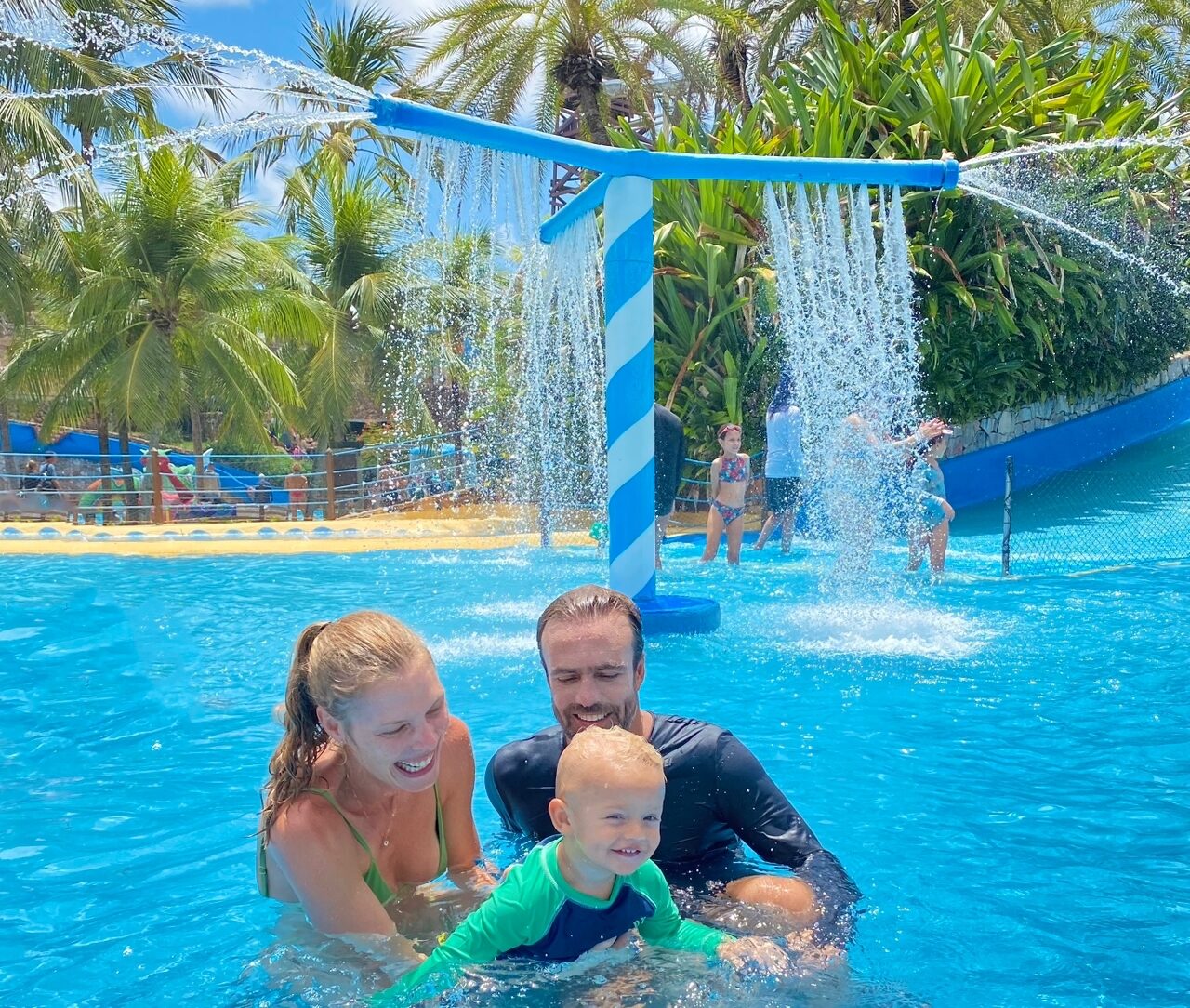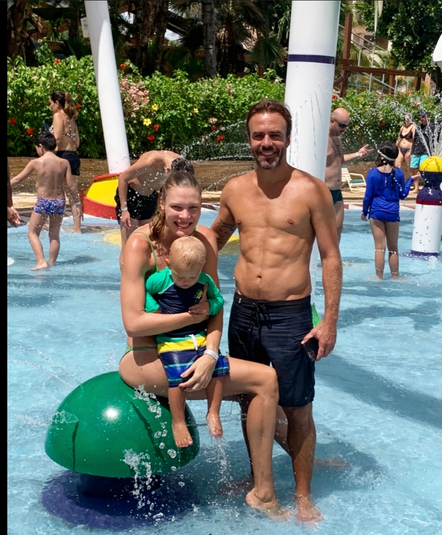 Roger Flores e a esposa Betina Schmidt tiraram uns dias de férias para aproveitar o calor do Ceará com o filho Tom (1), no Aqua Park, um dos parques aquáticos mais visitados da América Latina. Pela primeira vez juntos no Beach Park, eles curtiram as atrações infantis como a Arca de Noé e ficaram hospedados no Suites Beach Park Resort.