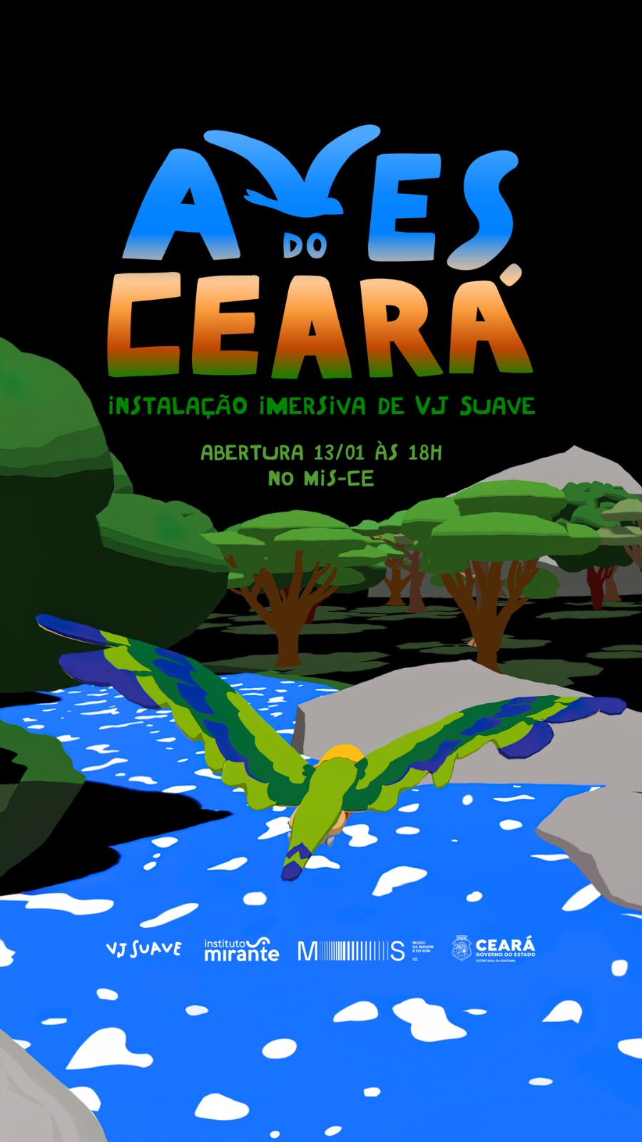 O Museu da Imagem e do Som convida para a abertura da instalação imersiva “Aves do Ceará”, produzida por VJ Suave, no dia 13 de janeiro (sábado), às 18 horas, com apresentação do Grupo Uirapuru Orquestra de Barro.
