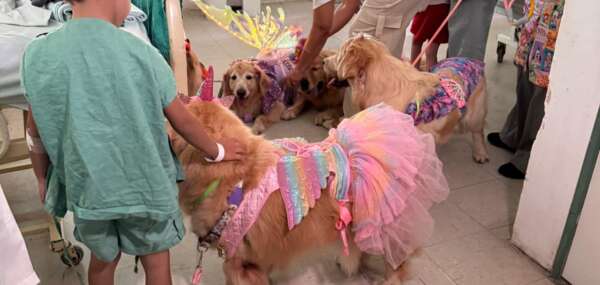 Vestidas com adereços alegres e temáticos, muitos lembrando as cores e a folia da festa, as cachorrinhas da raça golden retriever circularam pelos corredores da Pediatria, convidando as crianças a interagir e fazer fotos.
