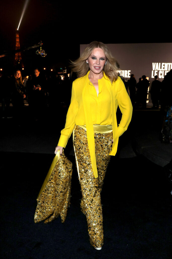 Kylie Minogue foi outra das várias caras conhecidas que não faltaram ao evento, tendo-se destacado com um visual amarelo, também ele brilhante.