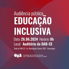 No dia 26 de junho, às 8h, será realizada a Audiência Pública sobre Educação Inclusiva no auditório da OAB-CE. O evento, organizado pela Comissão de Direito da Pessoa com Transtorno do Espectro Autista (TEA), tem como objetivo debater e promover políticas de educação inclusiva para pessoas com TEA.