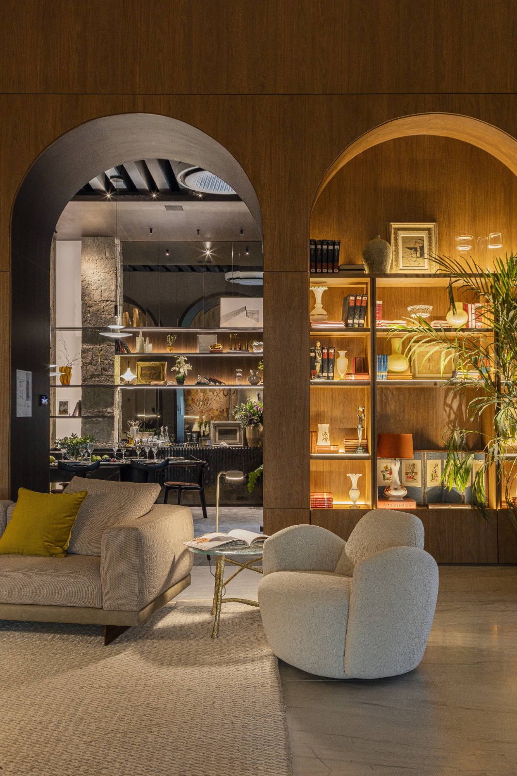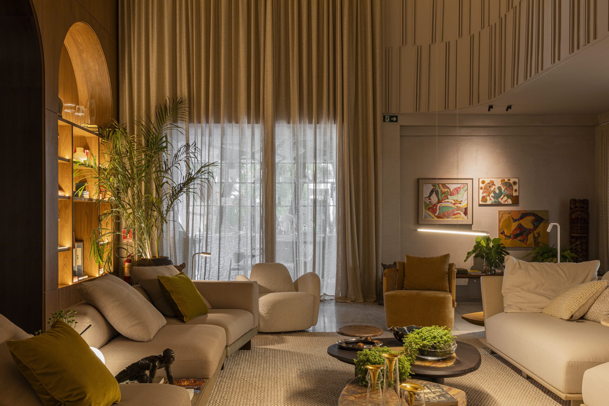 Destaque para quatro peças que expressam o design autoral, com assinatura do renomado Studio Roca, com o Sofá Netuno, que traz linhas retas e estrutura modular, garantindo conforto e versatilidade e o Banco Estação, que alia estética e praticidade com sua bandeja incorporada. Também a Mesa de Centro Itapirapuã, assinada pela arquiteta e designer Fernanda Marques, que destaca a harmonia entre madeira e pedra natural e a Mesa Lateral Galhos, de delicadeza escultural que confere leveza e elegância ao ambiente.