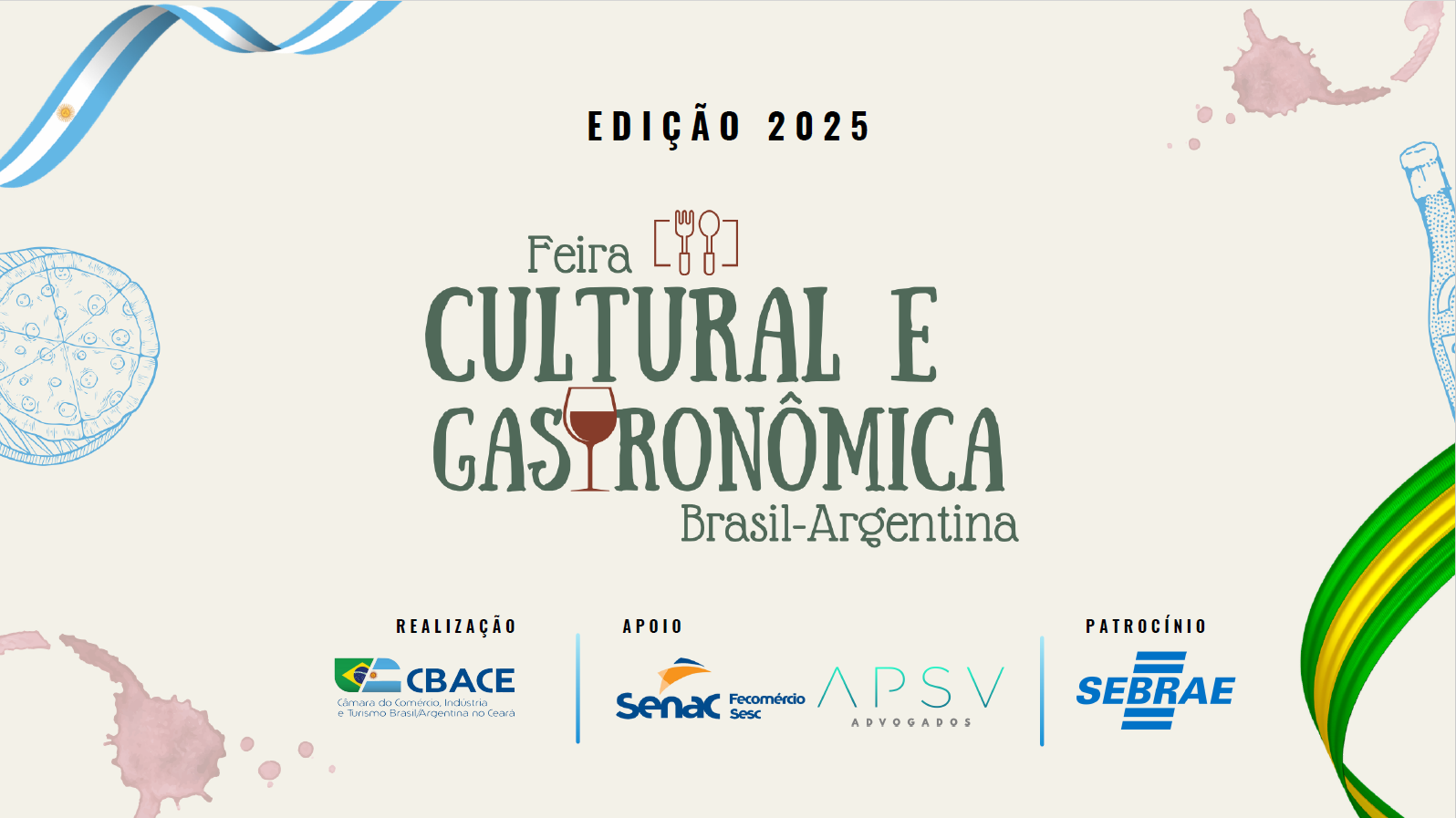 A segunda edição da Feira Cultural e Gastronômica Brasil-Argentina no Ceará conta com o apoio da Fecomércio Ceará e APSV Advogados, além do patrocínio do Sebrae. Mais informações sobre o evento, que tem entrada livre e gratuita para o público geral, podem ser obtidas nas mídias sociais da Câmara Brasil-Argentina no Ceará.