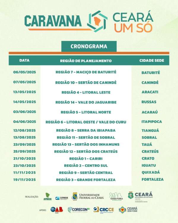 A Caravana, fruto do programa de governança interfederativa Ceará Um Só, teve início no dia 6 de maio e seguirá até o dia 19 de novembro, quando concluirá a visita às 14 regiões de planejamento do Ceará. Já participaram da jornada itinerante as regiões do Maciço de Baturité, Sertão de Canindé,  Litoral Leste e Vale do Jaguaribe, reunindo mais de 900 pessoas apenas em maio.