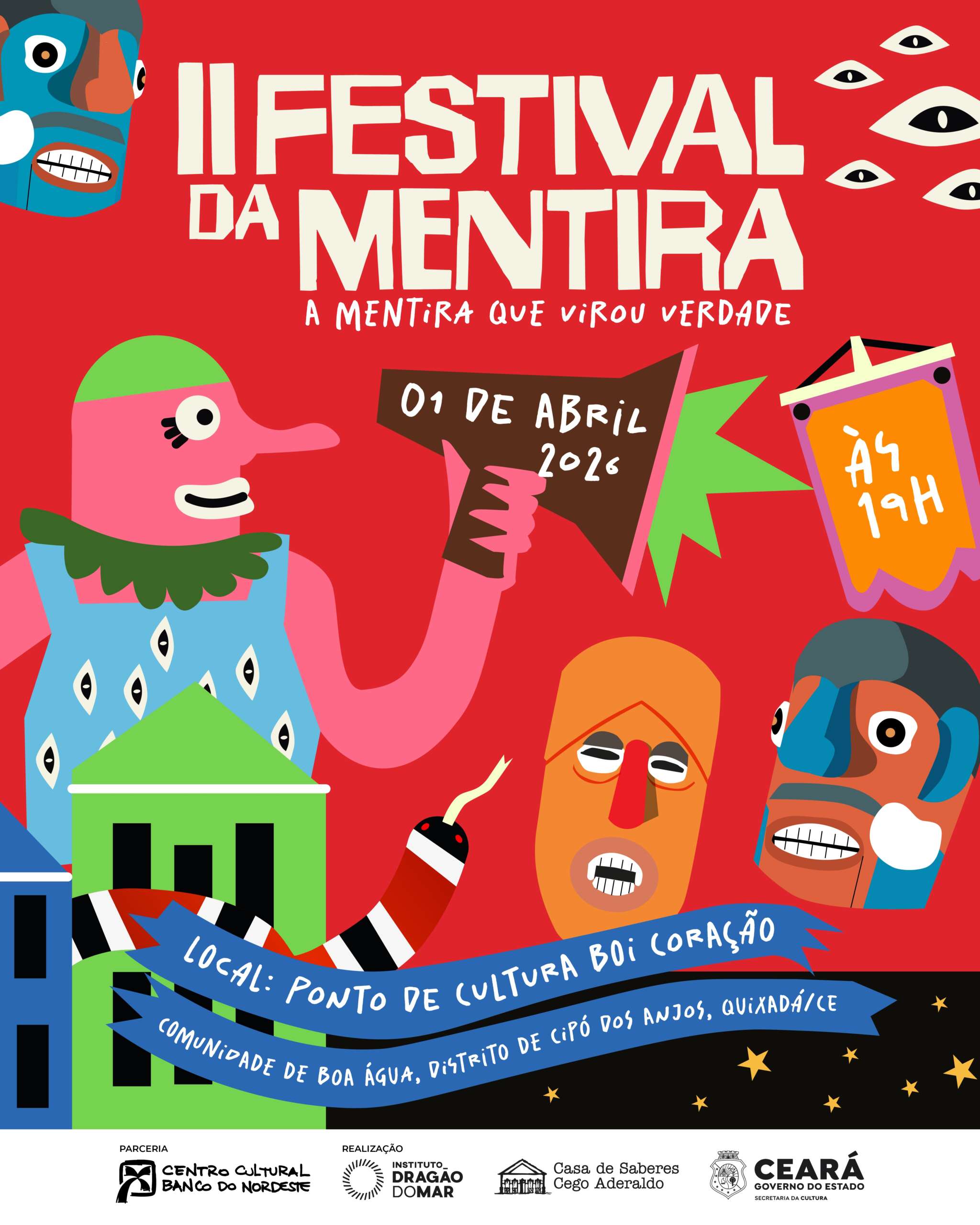Neste 1º de abril, o Ponto de Cultura Boi Coração, na comunidade de Boa Água / Cipó dos Anjos, no distrito de Quixadá-CE, receberá a 2ª edição do Festival da Mentira do Sertão Central, ação cultural promovida pela Casa de Saberes Cego Aderaldo. Após o sucesso da primeira edição, o evento retorna com a proposta de celebrar o humor cearense e destacar sua importância como expressão viva da cultura popular e da tradição oral do Sertão Central.