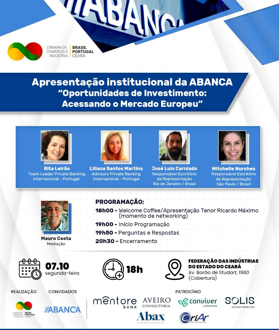 Na segunda-feira, dia 7 de outubro, às 18h, a Câmara Brasil Portugal no Ceará (CBPCE) realizará um evento em parceria com o banco português ABANCA na cobertura da Federação das Indústrias do Estado do Ceará, com o tema Apresentação Institucional do ABANCA “Oportunidades de Investimento: Acessando o Mercado Europeu”. À frente da Câmara Brasil Portugal no Ceará está o presidente Raul dos Santos Neto.