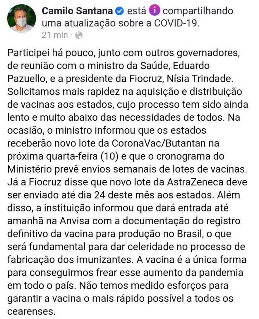 “O ministro informou que os estados receberão novo lote da CoronaVac/Butantan na próxima quarta-feira (10) e que o cronograma do Ministério prevê envios semanais de lotes de vacinas”, disse Camilo através das redes sociais.