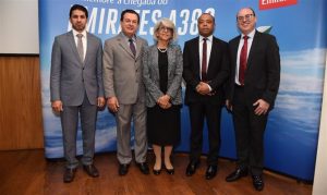 Ibrahim Salem Al-Alawi, consul geral dos Emirados Arabes no Brasil, Valter Patriani da CVC, Hafsa Al Ulama, embaixador dos Emirados no Brasil, Stephane Perard, da Emirates e Fabio Mader da CVC