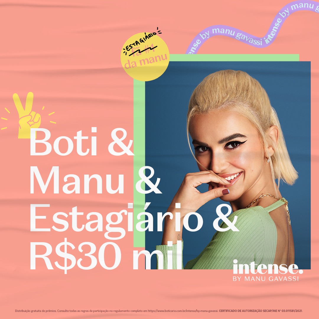 Seria o melhor estágio do mundo? Não, é melhor ainda! Destaque na internet, a atriz, cantora, criadora de conteúdo e empresária Manu Gavassi se uniu ao Boticário para escolher, entre milhares de pessoas, um “estagiário”, que poderá acompanhar a artista e a marca na criação de conteúdos digitais para a campanha de lançamento dos novos produtos da sua linha Intense by Manu Gavassi, 100% vegana e colorida. Além de ter a oportunidade de viver a experiência, o escolhido ainda ganhará um prêmio de 30 mil reais e mais 5 mil reais em produtos de maquiagem Intense. Quem não vai querer essa chance?