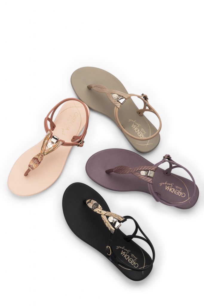 A grande novidade fica por conta da delicada sandália com pingente removível e tira reversível, que proporciona duas opções de estampa no mesmo produto: grafia e metalizado. Além dela, a coleção apresenta pela primeira vez uma sandália com saltinho bloco confortável, que vem com tira metalizada, pingente e detalhe de grafia no calcanhar. Além das sandálias, a coleção conta com a clássica rasteirinha, um modelo gracioso com grafia localizada e estética também inspirada na natureza.