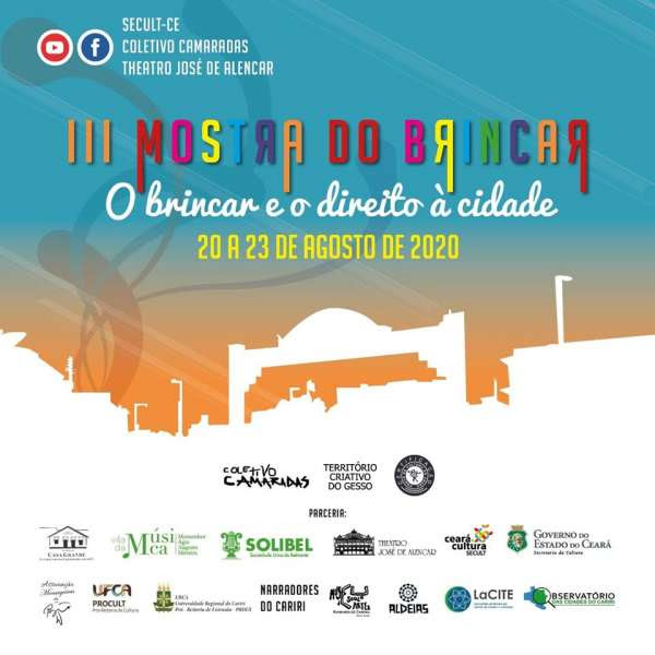 Essa discussão entra na centralidade da reflexão de qual cidade está sendo construída, a partir do seu centro e de suas margens que atende às especificidades da infância. Com base nestas percepções, o Ponto de Cultura Coletivo Camaradas e a Rede de Articulação Território Criativo do Gesso, em parceria com a Secretaria da Cultura do Estado do Ceará, o Theatro José de Alencar, a Vila da Música, a Fundação Casa Grande, a Associação Mensageiras da Paz, A Universidade Federal do_Cariri (UFCA), a Universidade Regional do Cariri (URCA), o Coletivo Narradores do Cariri, o Museu Escola de Artes Raimunda de Canena, a Associação Libertária de Desenvolvimento e Educação Interativa Ambientalmente Sustentável –  ALDEIAS, o Laboratório de Estudos em Gestão de Cidades e Territórios (LACITE) e o Observatório das Cidades do Cariri apresentam, de 20 a 23 de agosto de 2020, a III Mostra do Brincar, com o tema “o brincar e o direito à cidade”.