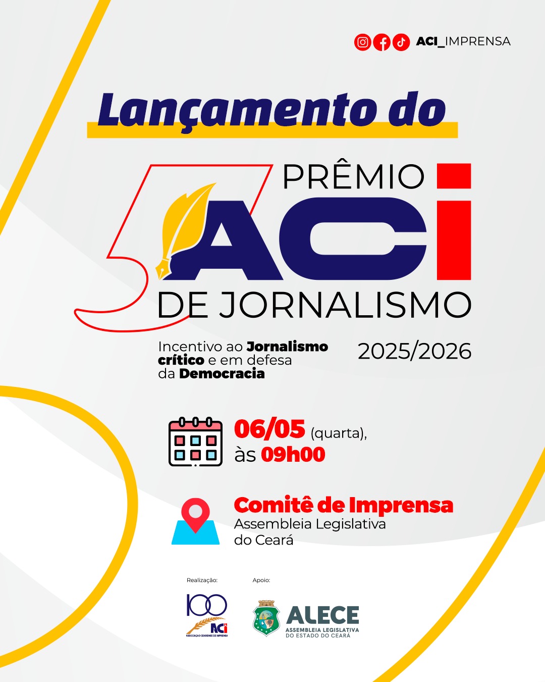 A Associação Cearense de Imprensa (ACI) lança oficialmente a edição 2025-2026 do Prêmio ACI de Jornalismo, no dia 6 de maio, quarta-feira, às 9h, no Comitê de Imprensa da Assembleia Legislativa do Estado do Ceará – Alece.