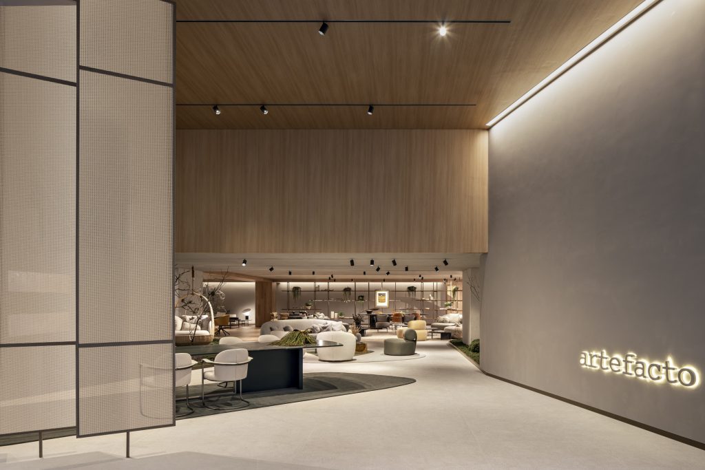 Para comemorar esse momento especial, um projeto igualmente exclusivo. Um showroom, de 1000 m², que celebra, em grande estilo, a herança artesanal, fatto a mano, do móvel Artefacto, colocada em patamar de igualdade com o design exclusivo e internacional da marca. Um espaço de exibição, permanente e interativo, repleto de conotações sensoriais, e voltado, exclusivamente, para a apresentação das coleções de mobiliário autoral produzidas hoje pela empresa.