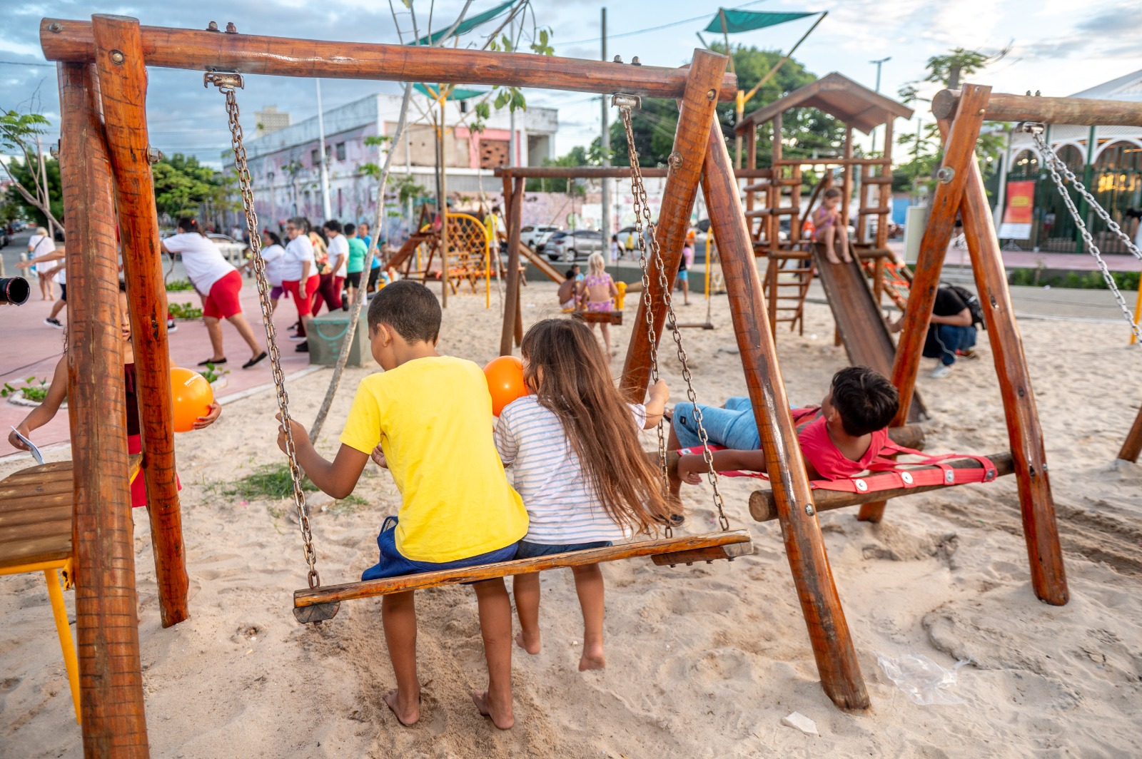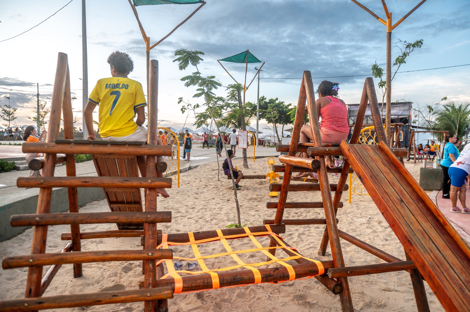 Construído com materiais recicláveis, como eucalipto de replantio, metal com pintura industrial e sombrite para conforto térmico, o equipamento transforma resíduos em possibilidades. O projeto inclui gangorra, balanços com assento para acompanhantes, escorregadores com interligação, suportes sombreados com trepa-trepa, além de uma torre em forma de casinha com escorregador e balançador. A criação leva a assinatura do artista e designer Narcélio Grud, conhecido por unir arte urbana e sustentabilidade.