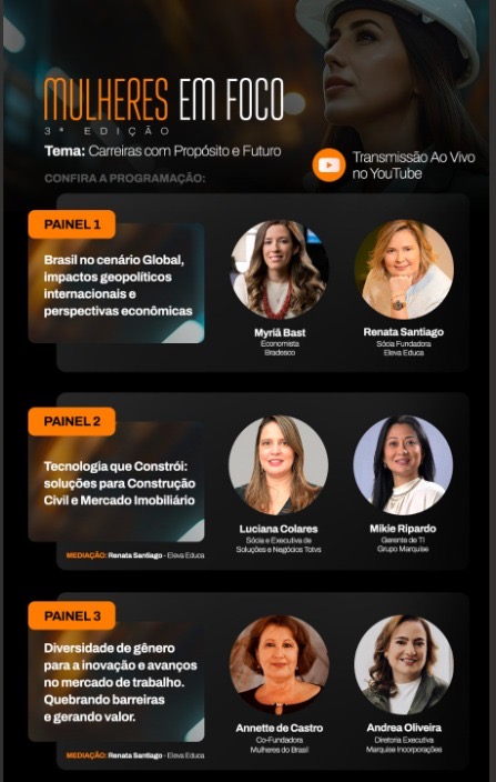 Na programação desta edição, três painéis abordarão temas atuais e estratégicos. A diretora executiva da Marquise Incorporações, Andrea Oliveira, divide a mesa com Annette de Castro, fundadora do grupo Mulheres do Brasil, para discutir como a diversidade de gênero impulsiona a inovação e gera valor nas organizações. Em seguida, Myriã Bast (Economista – Bradesco) e Renata Paula (CEO Eleva Educa) analisam o Brasil em perspectiva global, com foco nos impactos geopolíticos e econômicos. O evento será encerrado por uma conversa sobre transformação digital e eficiência no setor imobiliário, com Luciana Colares (Sócia e executiva de soluções e negócios na TOTVS ) e Mikie Ripardo (Gerente de TI – Grupo Marquise).