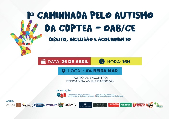 A Comissão de Direito da Pessoa com Transtorno do Espectro Autista (CDPTEA), da Ordem dos Advogados do Brasil – Secção Ceará (OAB-CE), realiza no próximo sábado (26/04), a 1ª Caminhada pelo Autismo. A saída será na Av. Beira Mar, no espigão da Av. Rui Barbosa, às 16h.