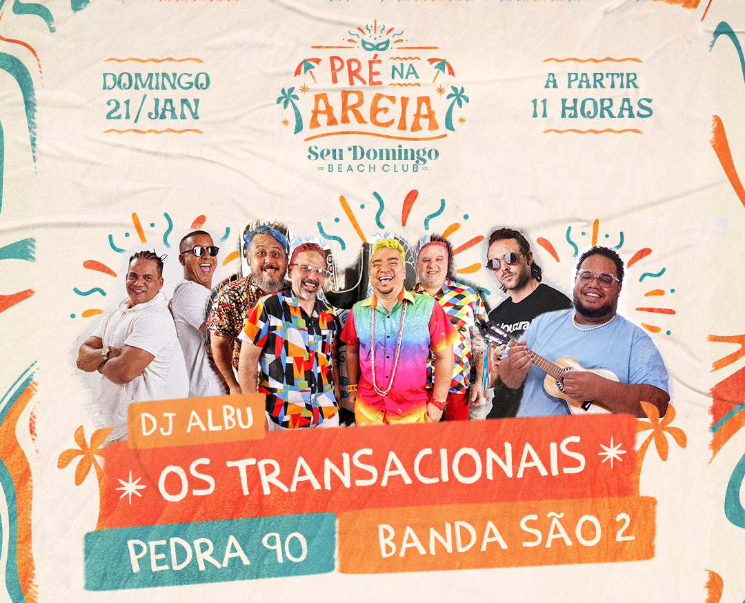 Para o próximo domingo, 18, a animação vai ser comandada por DJ Albu, Pedra 90, Os Transnacionais e São 2. Para a 3ª edição do Pré na Areia, as ofertas promocionais seguem valendo: os clientes que chegarem entre 9h e 14h não irão pagar o couvert artístico, e ainda terão descontos em produtos da casa, como o kit de caranguejo e combo de bebidas e drinks, cujos preços estarão com valores promocionais. A programação começa às 11h e vai até às 21h.