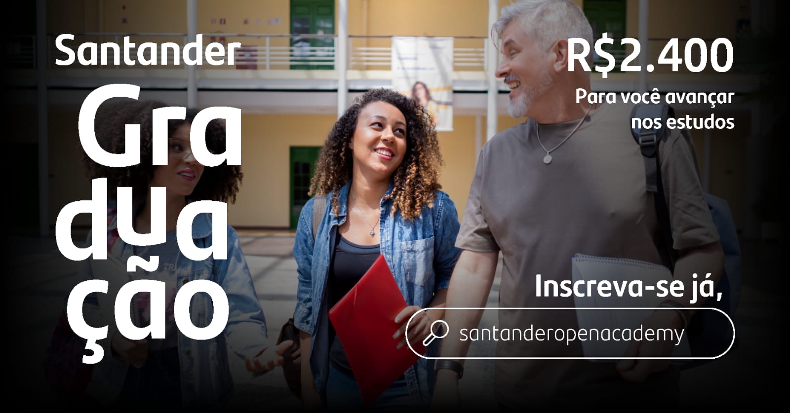 Estão abertas as inscrições para o programa Santander Graduação 2024, que vai entregar 1.500 bolsas de apoio financeiro no valor de R$ 2,4 mil para alunos de graduação, pós-graduação e cursos técnicos nas modalidades presencial e EAD, válidos para mais de 60 instituições conveniadas ao programa banco e podem se inscrever até 27/10, através da plataforma Santander Open Academy.