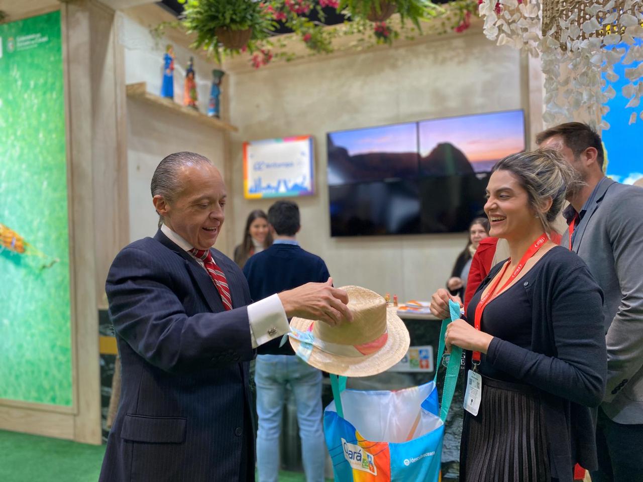 Embaixador do Brasil na Espanha Pompeu Neto, visitou o estande do ceará e ganhou alguns atrativos e brindes cearenses