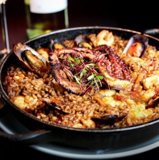 Este prato emblemático revela uma alquimia de texturas e sabores cuidadosamente orquestrada. A base cremosa e envolvente do arroz arbóreo, cozido lentamente até atingir o ponto perfeito, serve de leito para uma generosa seleção de frutos do mar frescos e suculentos, cada um deles agraciado pelo toque defumado e pela intensidade da brasa.