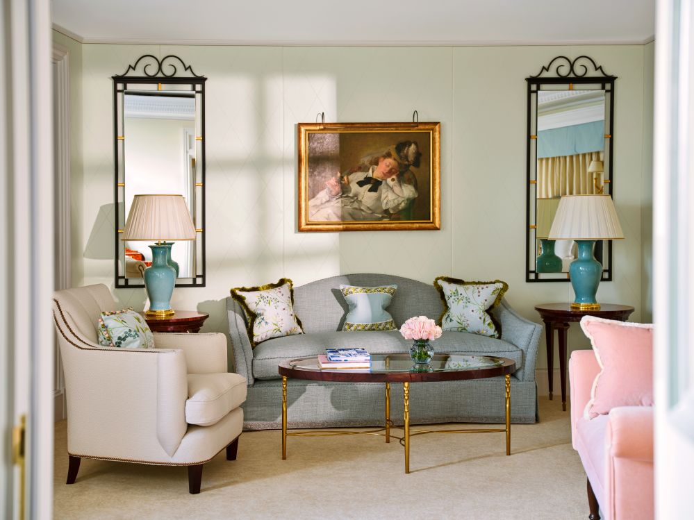 Ocupando uma vasta esquina do oitavo andar, a Suíte Royal ergue-se sobre o Hyde Park com uma sensação de imponência e vistas panorâmicas das copas das árvores do parque, do lago Serpentine e além. Combinando perfeitamente a grandeza atemporal do The Dorchester com toques contemporâneos, Rochon buscou inspiração nas paisagens britânicas, com a suíte apresentando papel de parede floral, tons pastéis suaves, tapetes com padrões personalizados e pisos de parquet Versailles.