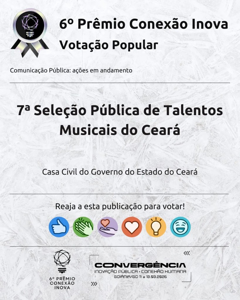 O Laboratório de Inovação e Dados do Governo do Estado do Ceará (ÍRIS) está participando do 6° Prêmio Conexão Inova, em votação que ocorre até sexta-feira (16/01). O projeto inscrito é o edital da 7ª Seleção Pública de Talentos Musicais do Ceará, na categoria Votação Popular.